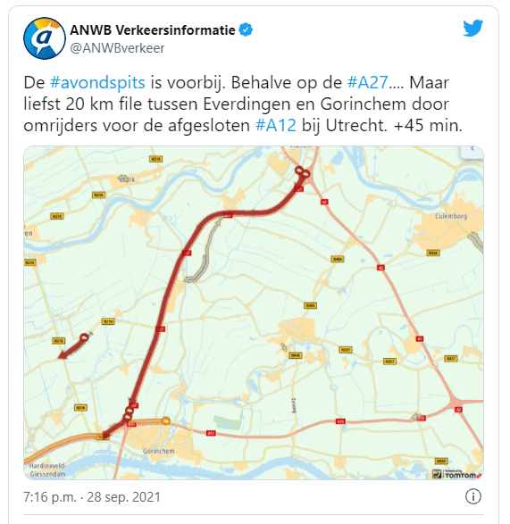 De A12 bij Nesselande in de richting van Gouda, tussen Oudenrijn en Nieuwerbrug is tot 7 oktober 2021 gesloten. Dat dit voor grote files zorgt (vooral richting de omleiding op de A27) bleek de eerste dagen van de afsluiting.