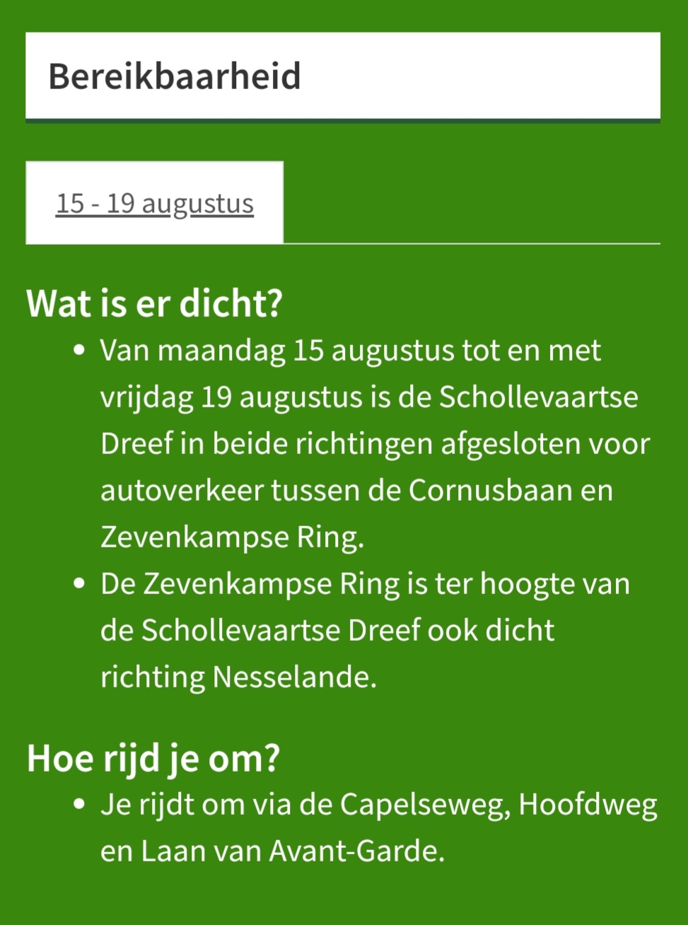 De verbinding Hoofdweg richting Nesselande via de Schollevaartse Dreef is welzeker in beide richtingen afgesloten aangezien er nieuw asfalt wordt neergelegd in deze periode.