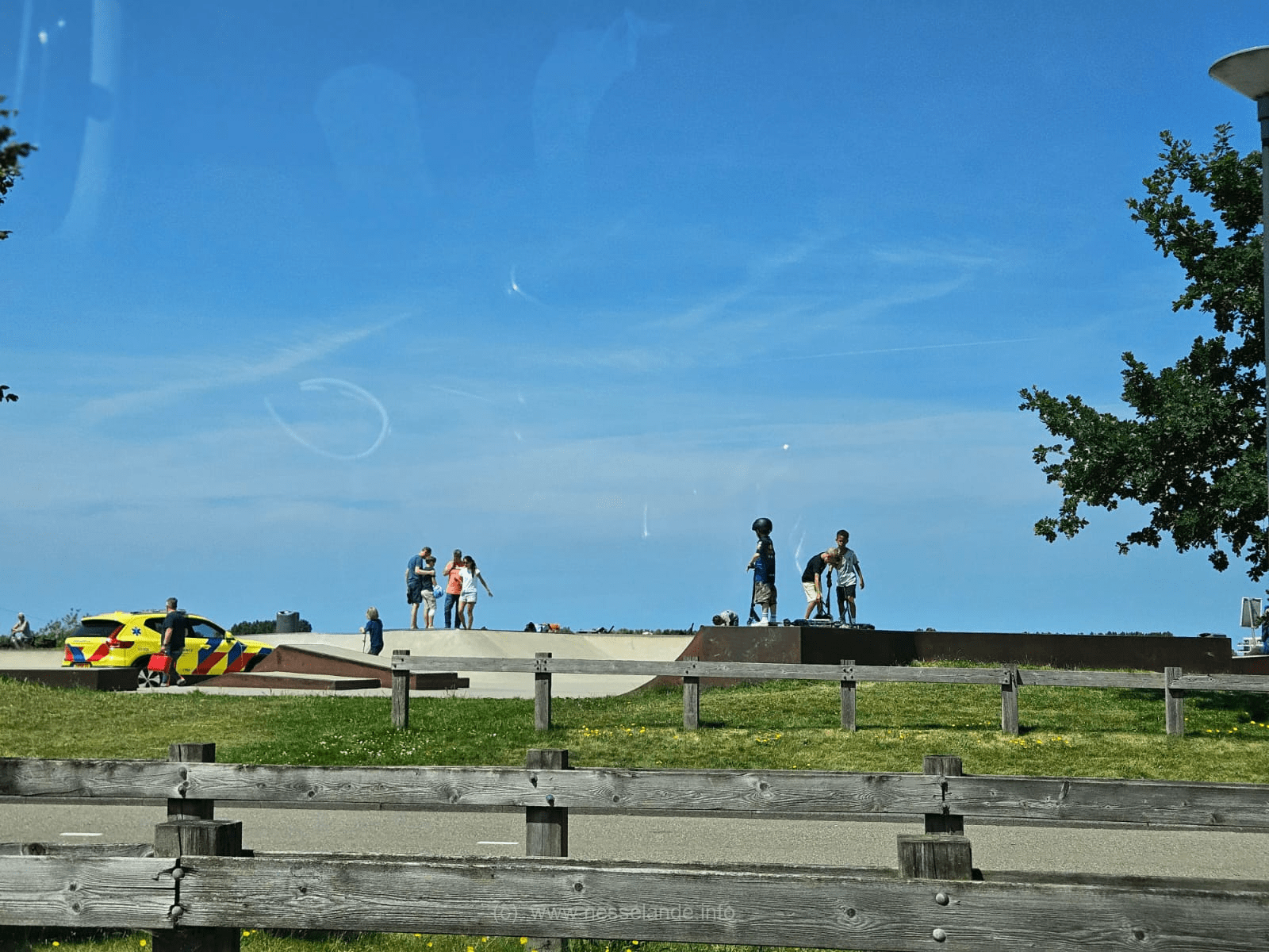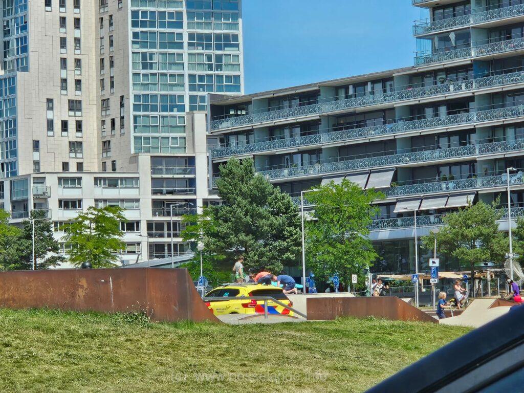 Een markante actie van deze ambulance die op de zonnige woensdagmiddag het skatepark Nesselande aan de Kosboulevard inreedt op om een geblesseerde skater te helpen.