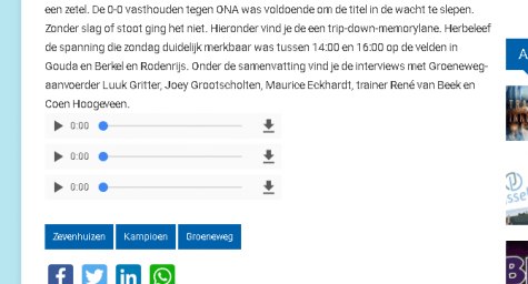 VV. Groeneweg werd mei 2018 kampioen in de uitwedstrijd bij ONA. Hiermee bereikt de club uit Zevenhuizen het spelen in de 1e klasse op zondag. Beleef hier de spanning nogmaals met het radiocommentaar uit IJssel-sport: