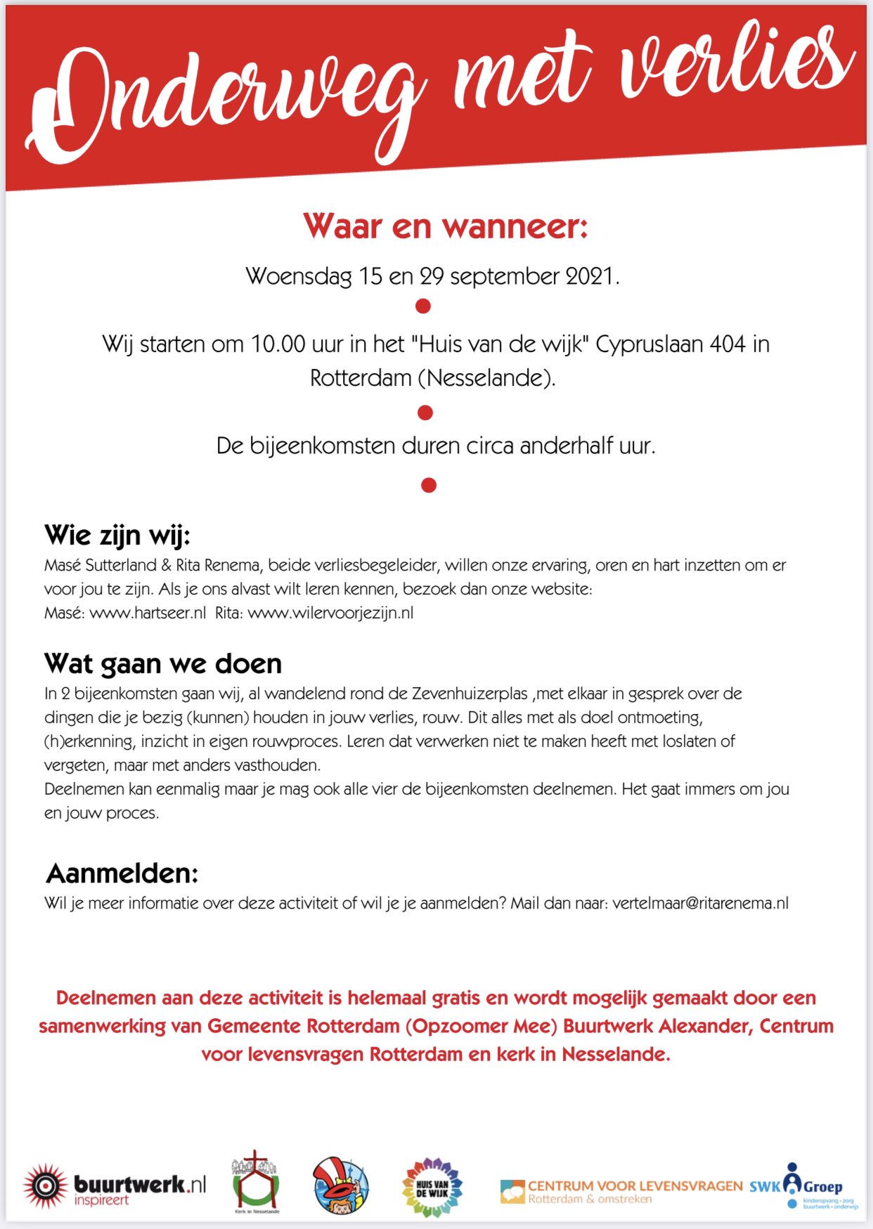 Rita Renema – geestelik verzorger – organiseert Samen met buurtwerk en Kerk Nesselande een wandeling: Onderweg met verlies. Op 15 en 29 september start 10.00 uur vanaf de Kristal. Gratis deelname.