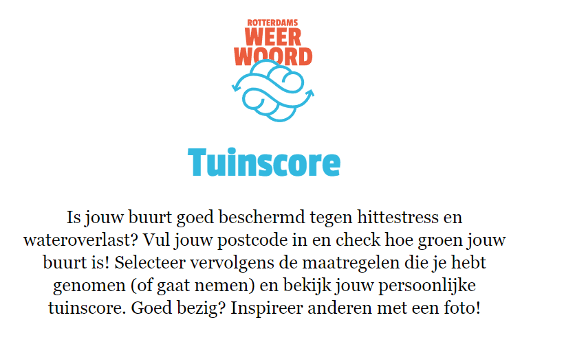Hier kan ook jij je steentje bij bijdragen! Ben jij benieuwd wat jouw klimaatlabel is? Check deze dan op www.rotterdamsweerwoord.nl/tuinscore. Door bij de Tuinscore uw postcode in te vullen, ziet u hoe regenbestendig en groen je buurt is en hoe groot het risico op hittestress is.