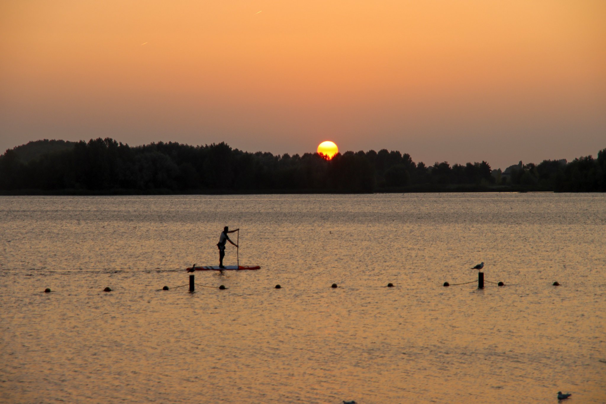Hoe sterk is de eenzame supper op de Zevenhuizerplas bij Nesselande strand tijdens zonsondergang, september 2021.