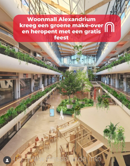 Maar dat is nog niet alles… Na maanden verbouwen is de woonmall klaar voor een frisse start. Waar je voorheen vooral winkelplezier vond, stap je nu binnen in een groene oase. 🌿 De buurt werd letterlijk in het groen gezet: denk aan zes meter hoge bomen, hangplanten die van bovenaf naar beneden slingeren, verticale tuinen en royale plantenbakken.