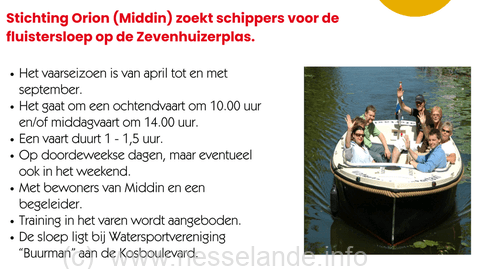 Stichting Orion (Middin) zoekt schippers voor de fluistersloep op de Zevenhuizerplas. Het vaarseizoen begint in april. De sloep ligt in de haven van Nesselande (Buurman) aan de Kosboulevard.