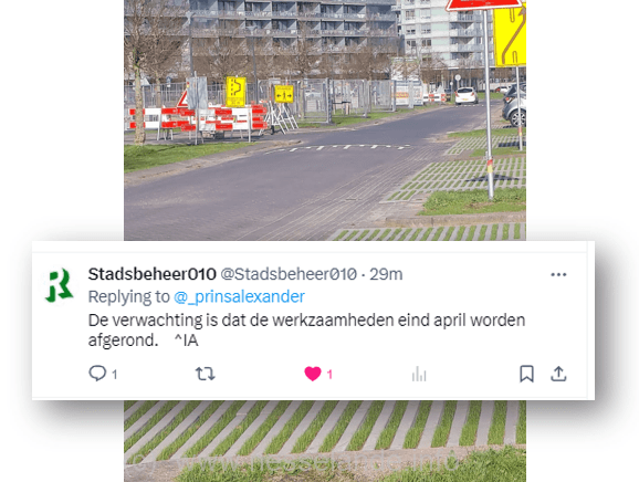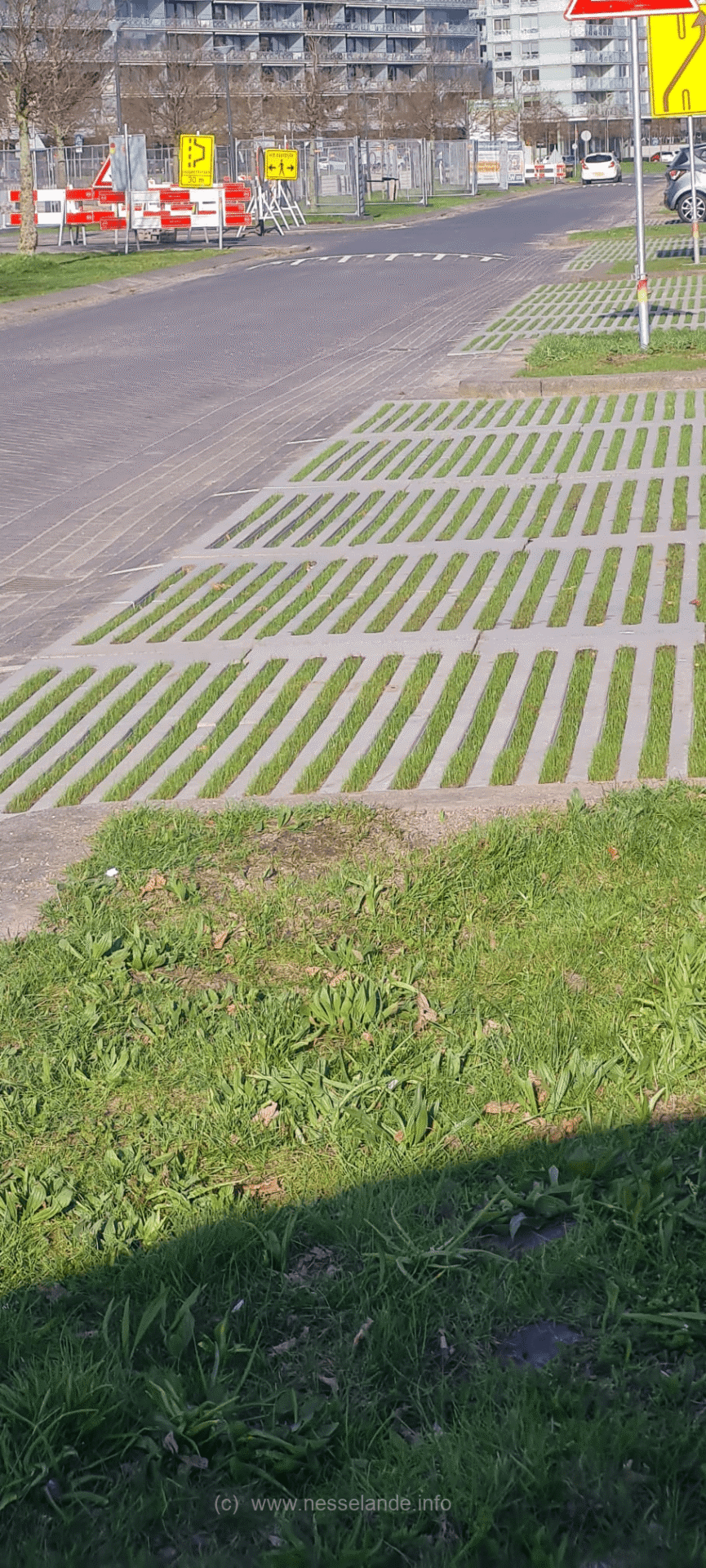 De linkerhelft is bijna af, tot aan eind april 2024 is de rechterkant delen van dag afgesloten – een baan dient in twee richtingen te worden bereden – voor het ombouwen van de parkeerplekken waar tussen de roosters groen gaat groeien voor een beter afwatering.