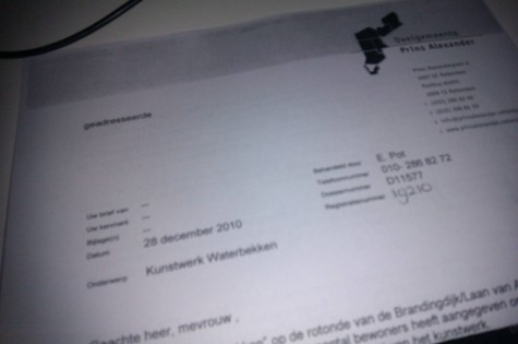 De deelgemeente Prins Alexander Rotterdam heeft bewoners op 28 december 2010 een brief gestuurd over de waterbak. Hierin wordt aangegeven dat diverse Nesselanders ‘niet blij zijn’ met het kunstwerk. Ook wordt aangeduid dat de huidige oplossing (een zeil over het kunstwerk) een tijdelijke oplossing is. Eind januari 2011 vindt er bewonersvergadering plaats waarbij een nieuwe planning en wellicht oplossing. Discussieer constructief mee op Nesselande.net.