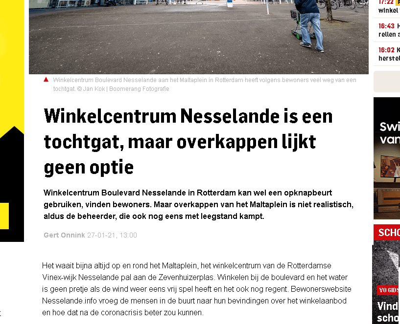 De situatie “winkelboulevard Nesselande” is een issue waar wij ons op Nesselande.info in veel polls en discussie reeds mee bezig hebben gehouden en hebben wij in de loop van de jaren aandacht gehad van media als AD.nl en diverse lokale media, zelfs in Zuidplas en verder in het Groene Hart. De verhuurder heeft al aangegeven dat overkapping te kostbaar zou zijn, ondanks het aanwezig zijn overkappingen in het originele ontwerp.