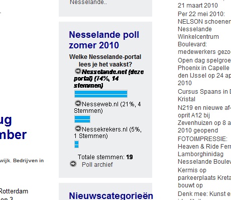 Welke portal jullie het meest bezoeken aangaande de wijk Nesselande? Is dat Nesseweb van WONIO, is dat Nessekrekers of.. deze portal Nesselande.net? Stemmen kan met de poll rechts in het midden.