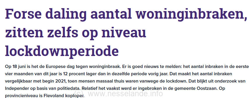 “De Europese dag tegen woninginbraak is een goed moment om stil te staan bij het belang van buurtpreventie. Met de juiste preventiemaatregelen kan de kans op een woninginbraak fors afnemen. Investeer in goede sloten en sluit ramen en deuren óók wanneer je even snel de hond uitlaat. En denk ook even goed na voordat je vakantiefoto’s op Facebook of Instagram plaatst. Dan weten veel mensen dat je niet thuis bent”, zegt expert woonverzekeringen Independer.